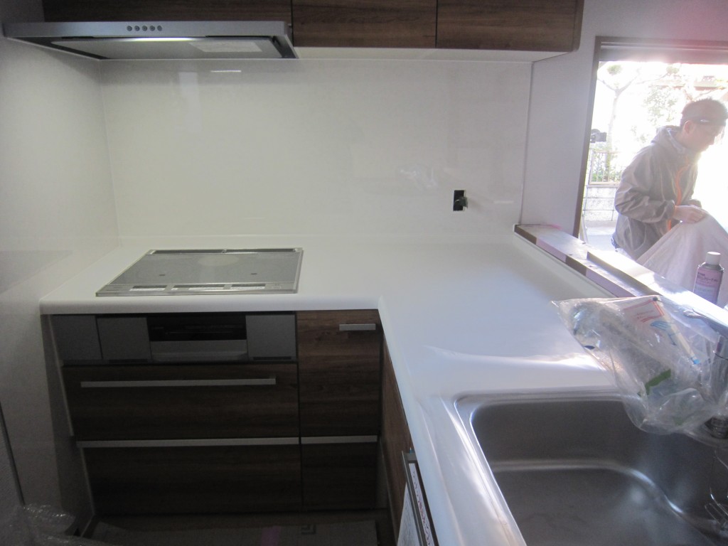 室内作業も進みまして本日はシステムキッチンの据付を実施しました。L型キッチンでスペースの 関係もありコンパクトにまとめてます。
