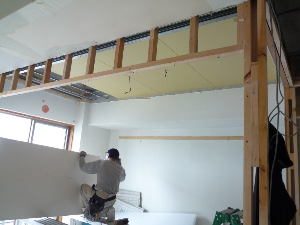今日はベテランの大工さんが出来ました軽天下地の天井に不燃ボードを張っています。