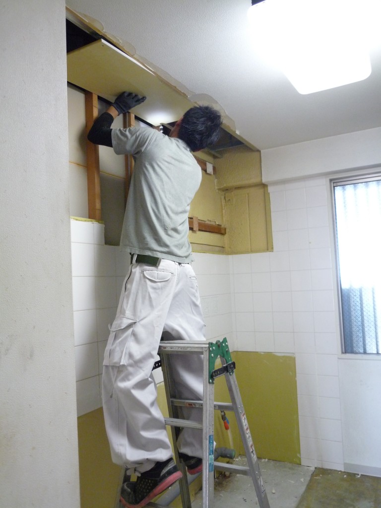 大工さんにより解体しましたキッチン廻りの天井も新たに不燃ボードを貼って仕上げをおこなってます。