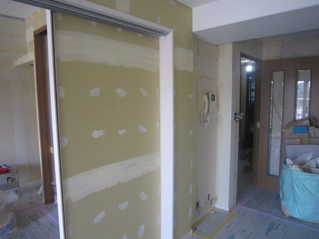 マンション内装工事に移りまいてクロス屋さんによりクロス貼る前のパテ工事を行いました。