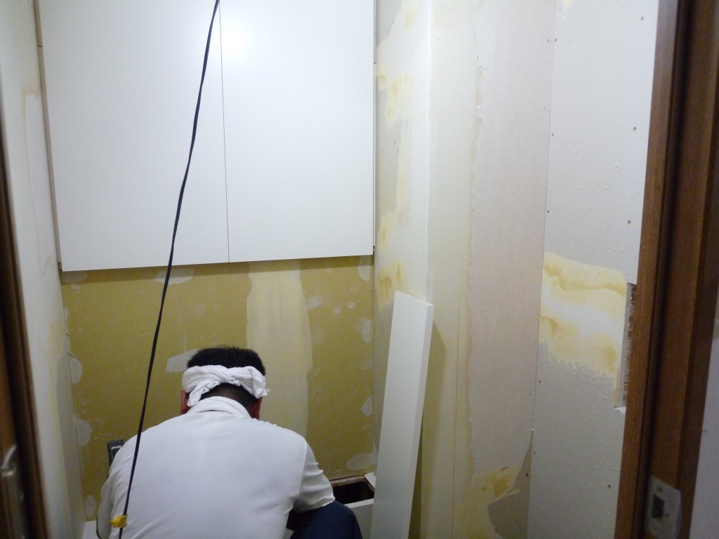トイレの棚を少し大きくしたので新たに扉を建具屋さんで作製していただきました。 合わせて配管カバーも取付けていただいています。