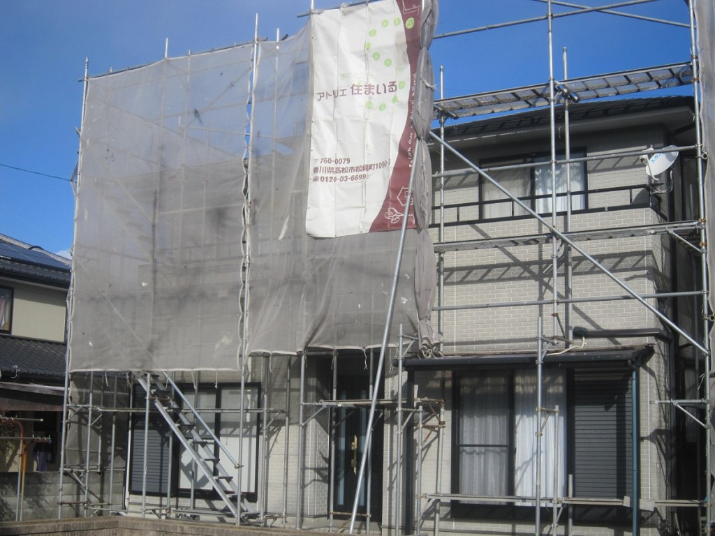 昨日からT様邸外壁塗装工事がスタートしまして先ず足場工事と防塵ネットの作業を行いました。 今後は外壁の水洗い、下塗り、中塗り、上塗りと進めます。