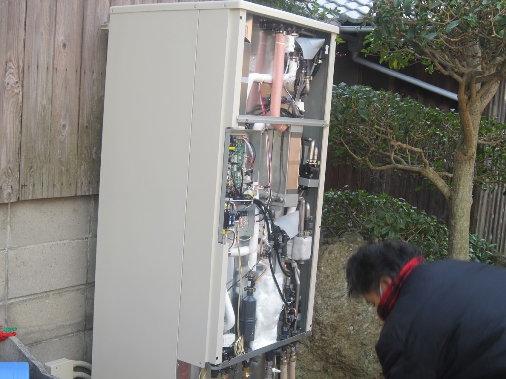 外部ではエコキュート機の設置工事が設備屋さん2名で作業してます。設置は1時間位で済みますが あとは洗面台の設置を行う予定です。 明日はキッチンの天井の塗装が入り、明後日は内部のクロス貼りを行います。