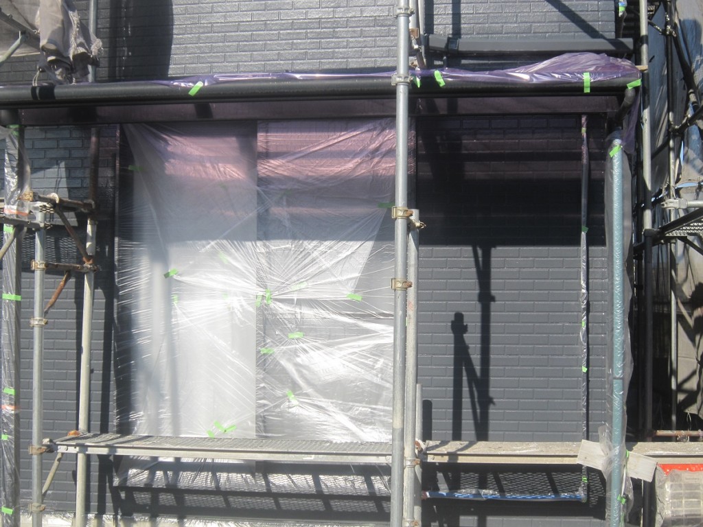 今日は天候にも恵まれまして塗装工事は建物本体サッシに養生シート張りまして 下塗り・中塗り、仕上げ塗りと作業が移ります。