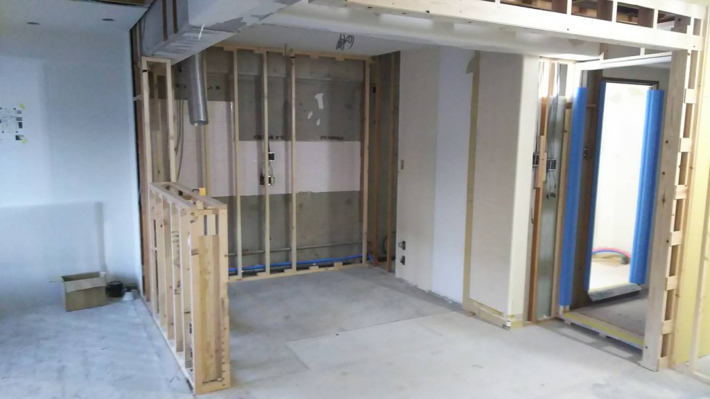 昨日の最終の写真です。 キッチン前のカウンターの壁が形になってきました。 壁や床が仕上がる前に、所定の位置まで配管や配線が移動しています。 左に見えるシルバーの丸筒はレンジフードの配管です。