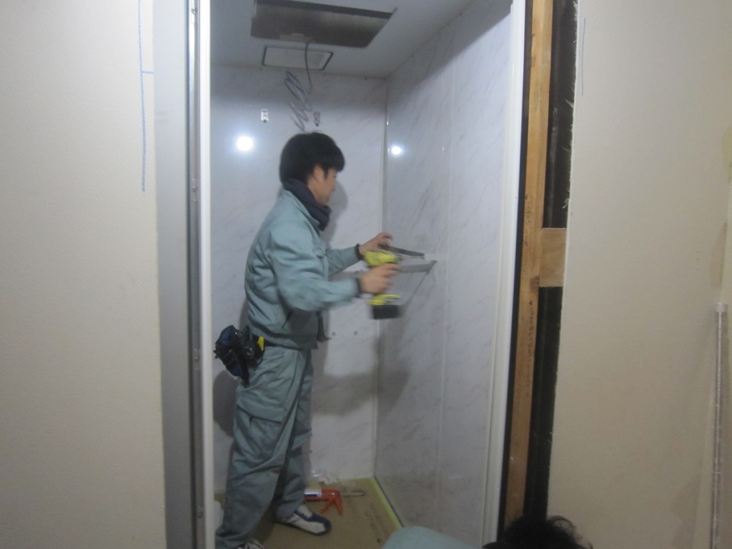 本日は大工工事は休みでシステムバスの据付工事を行ってます。現在は付属品の取り付けやコーキング等の作業を2名職人さんが取り組んでいまして、本日中に終了します。