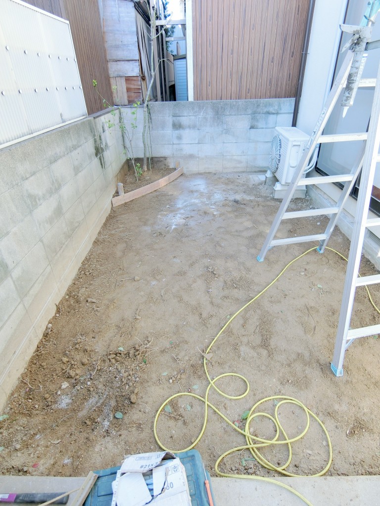 DAY1 (解体撤去) 残土を取り除き、鋤取りを行い、ブロックに土間の勾配のラインを記しています。 雨水等が溜まらないよう水勾配と呼ばれる傾斜がつけられ、 手前より奥がすこし高くなります。