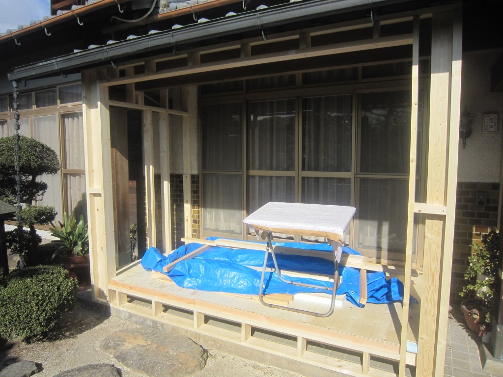 1階居間前に持ち出して木製サンルームを設置となり大工さんで木枠が出来ました。掃き出しのサッシの納入まちです。