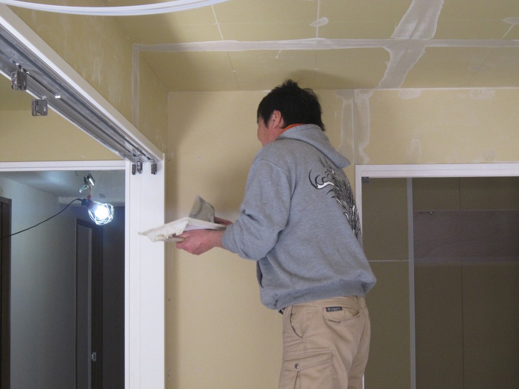 昨日で既存クロス剥がし終わりまして本日はクロス貼りの前工程のパテ作業をしてます。