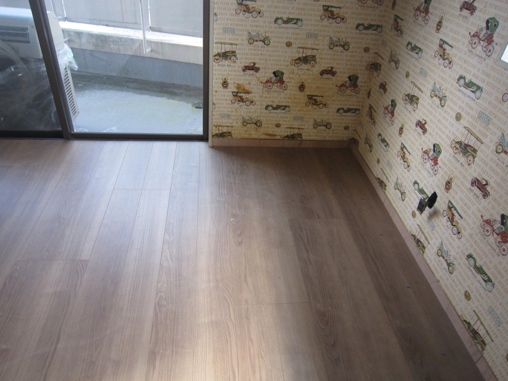 大工さんは子供部屋のフローリング張り作業してます。養生シート張る前のフロアです。