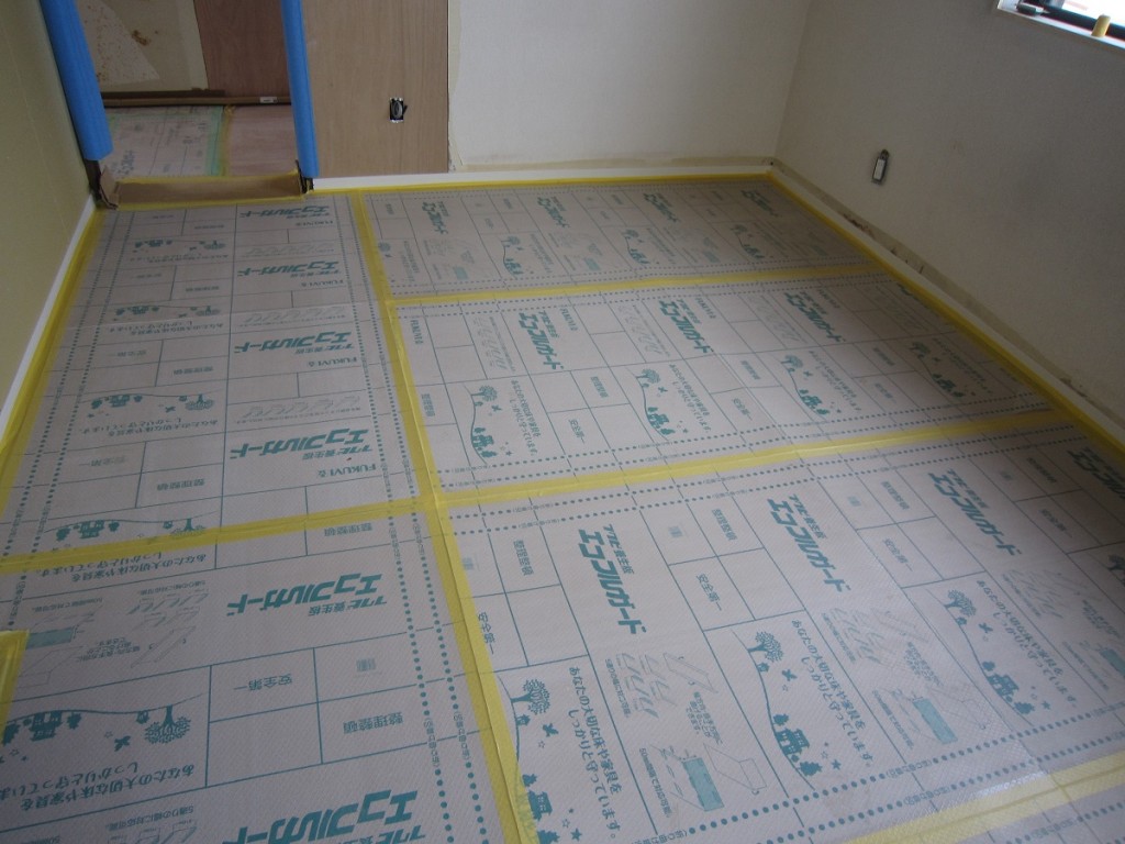 フローリング張りは全部屋終わりまして傷つき防止のため入念に養生シートで覆ってます。明日からは天井・壁のクロス貼りに備えまして、既存クロス剥しにかかります。