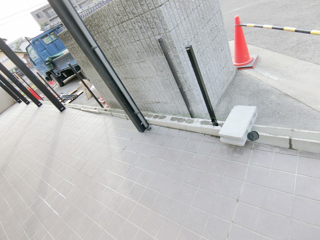 DAY4)フェンス支柱建て工事 糸を張り、位置がまっすぐになるよう確認しながら、あらかじめ設置位置をマーキングした場所に設置していきます。 手前の角が1本目の支柱です。