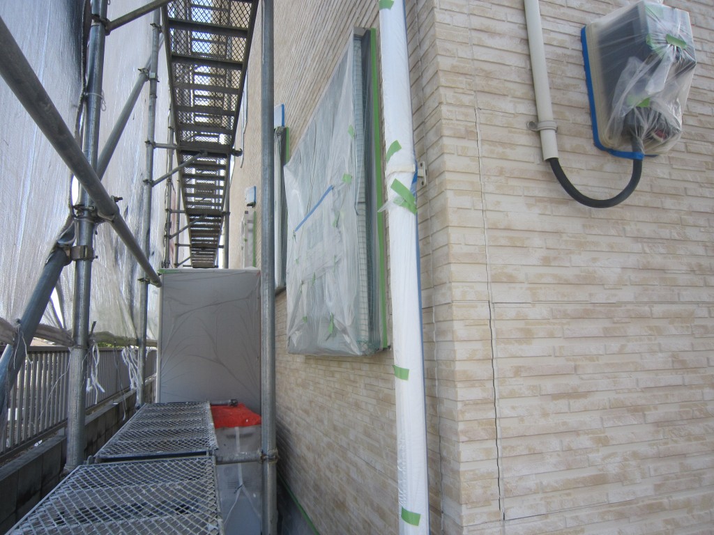 本日は天候に恵まれまして職人さんは建物廻りのサッシ、玄関廻り等の養生を行ってます。