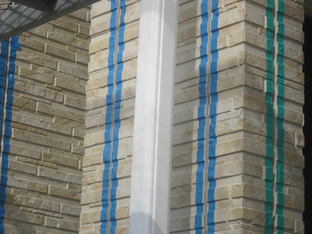 本日は天候に恵まれ塗装は済みましてサイデイングの目地にシーリングするため青いテープ貼り を行ってます。シーリングは目地から雨水侵入を防ぐ重要な作業です。