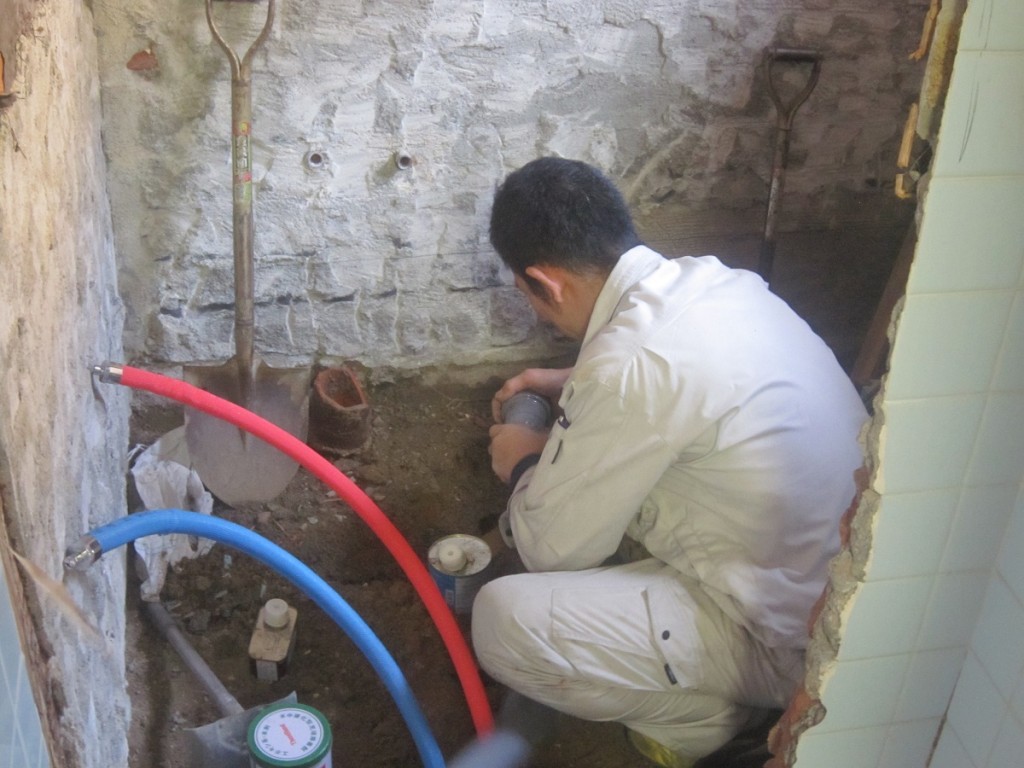 給排水管工事は午前中でほぼ済みまして、午後からは浴室の土間打ちでコンクリート打ち を予定しております。尚、赤のホースはお湯、青いホースは水の給水管となります。