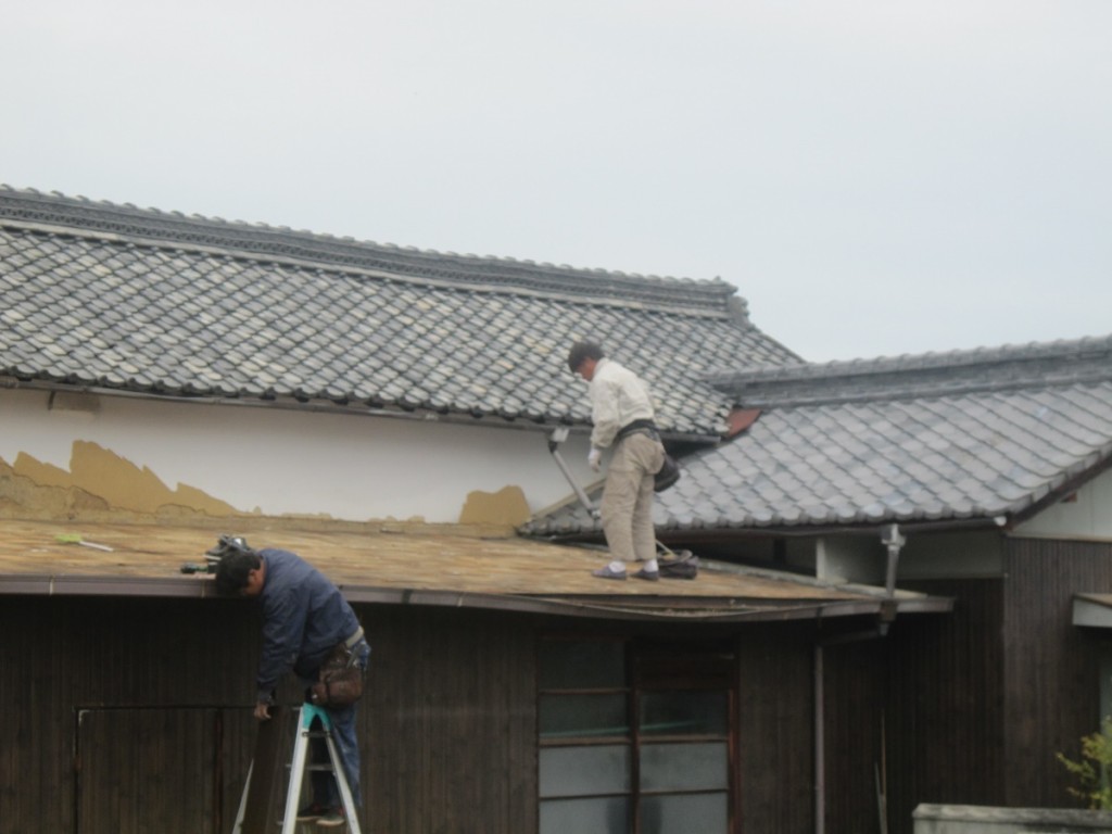 本日は天気に恵まれ遅れてました職人さん2名で納屋の屋根工事にかかりました。