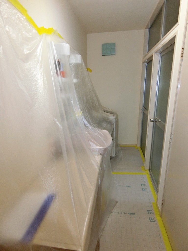 浴室とトイレ交換工事をさせて頂きます。 床や家具を傷つけない様、埃が入らない様、養生を済ませ、本日より着工しました。