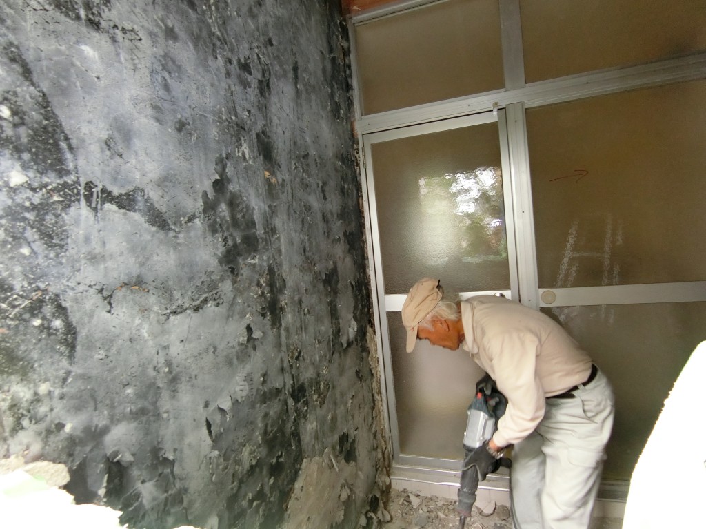 床や壁に貼られたタイルを丁寧に解体していきます。