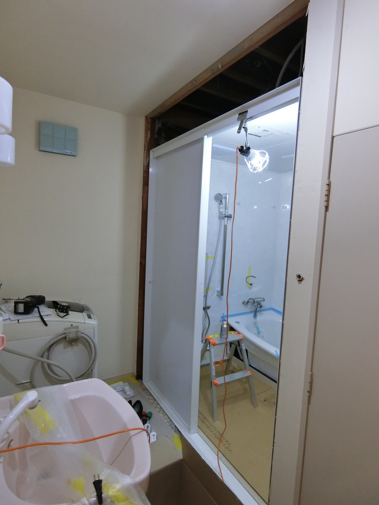 ドアは、ガラスの引違戸から、片引戸になりました。 浴室入口開口部は、明日から行う造作工事となります。