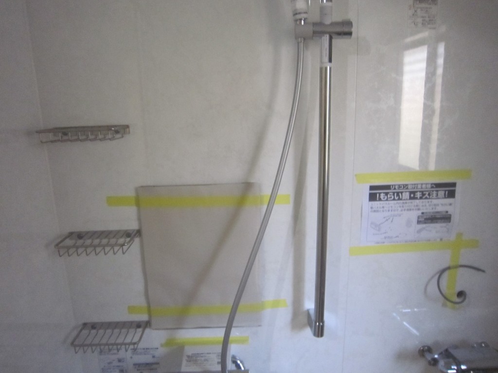 浴室内部はミラー、シャワ水栓や小物入れがありますが養生中です。早く風呂に入れるべく作業は急ぎます。