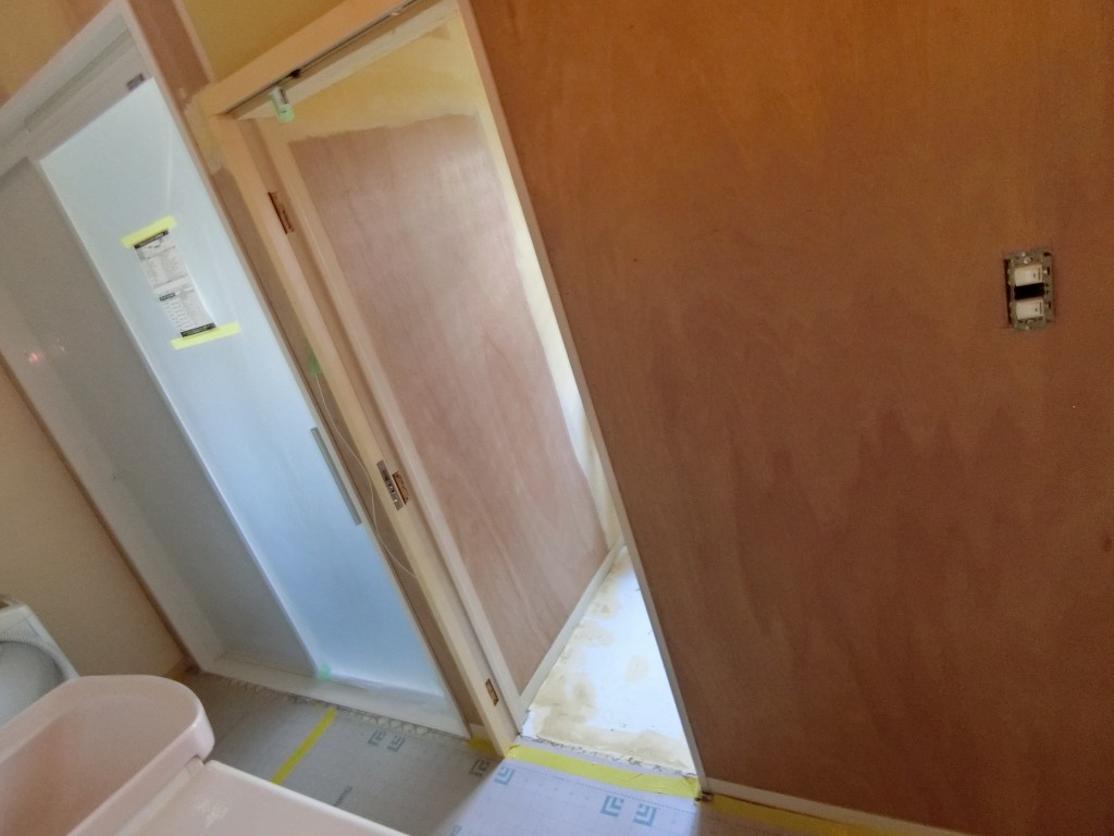 トイレと浴室の入口は、ともに引戸に変わり、 トイレドアと既存のスイッチが接触するために、 少し右に移動しました。 パチッと点灯した事が分かる、使い慣れた 大きめのスイッチをセレクトしています。