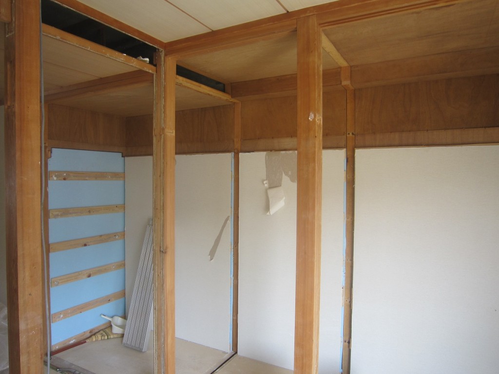 大工さんによる室内の改修工事を行ってます。押入れ部分の解体作業は済みました。