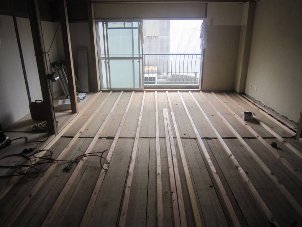 1部屋の和室の床上げの為根太布せ作業が終了しました。午後からは2部屋目の根太布せ作業に かかります。根太上にコンパネを張り最後はフローリングで仕上げます。