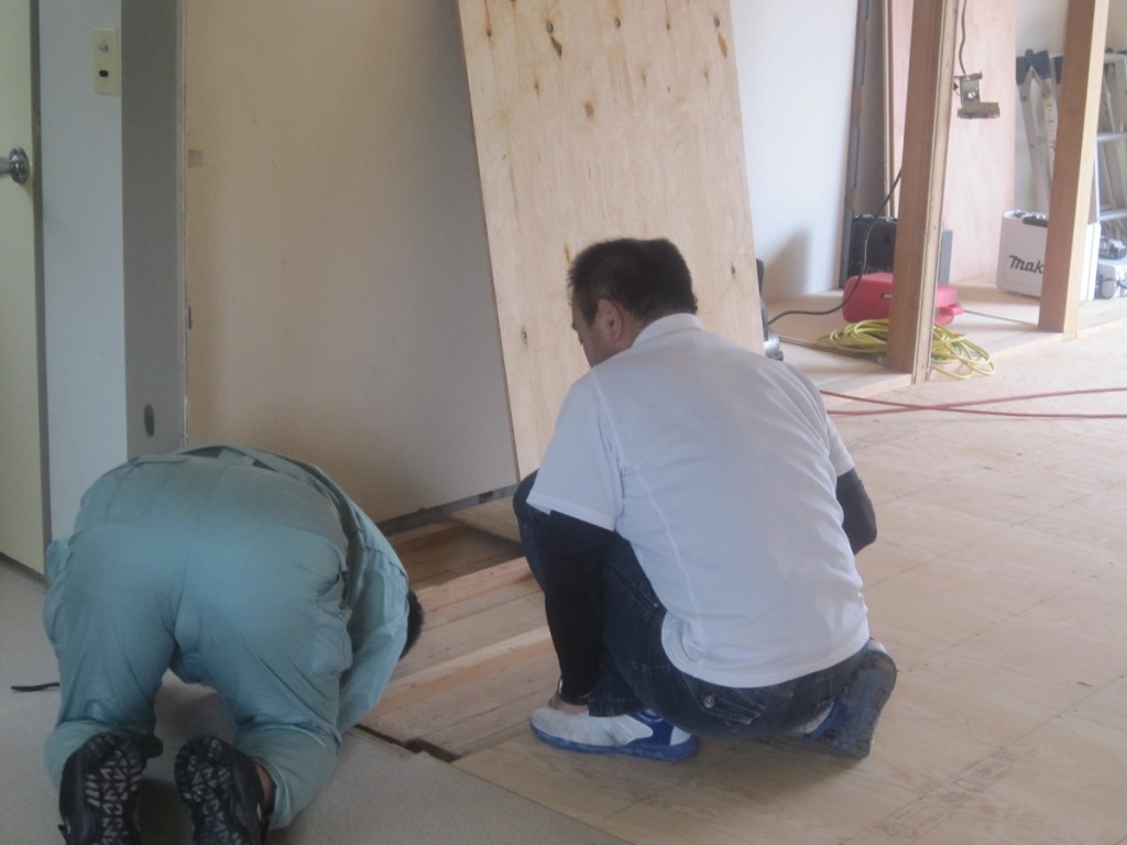本日は大工さん1名で作業してますが、設備屋さんと大工さんが給排水位置等打合せ中です。