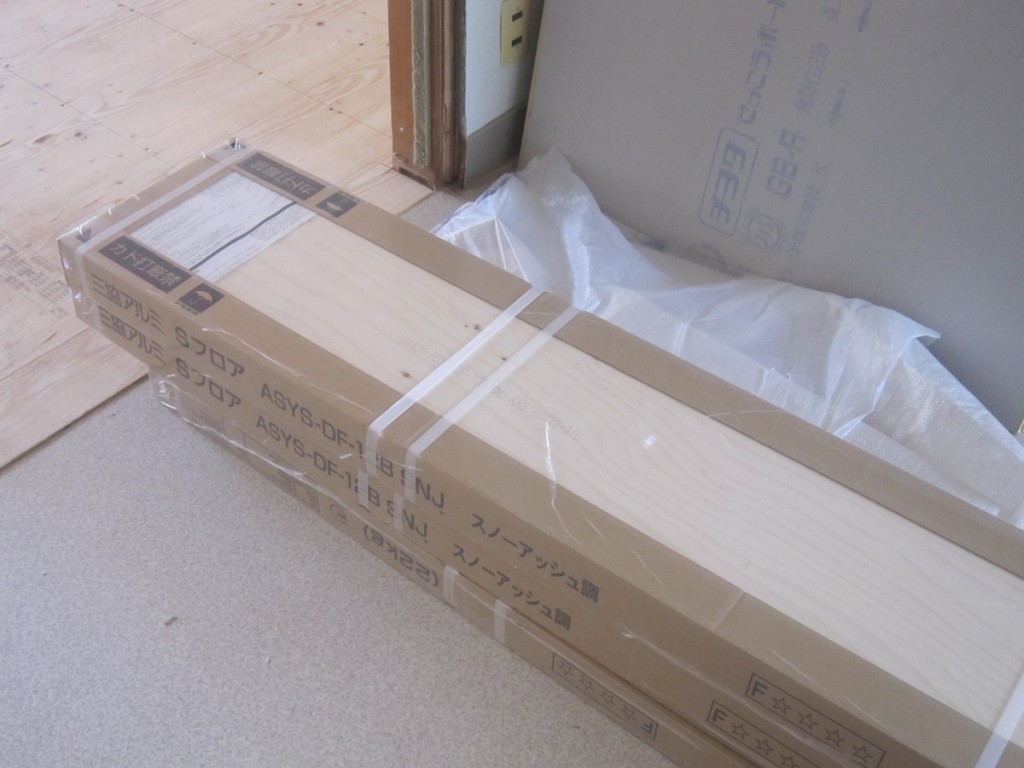 大工さんは本日2階3部屋フローリング張りに備えボード下地作業は終了しました。また、フローリング材を納入しました。