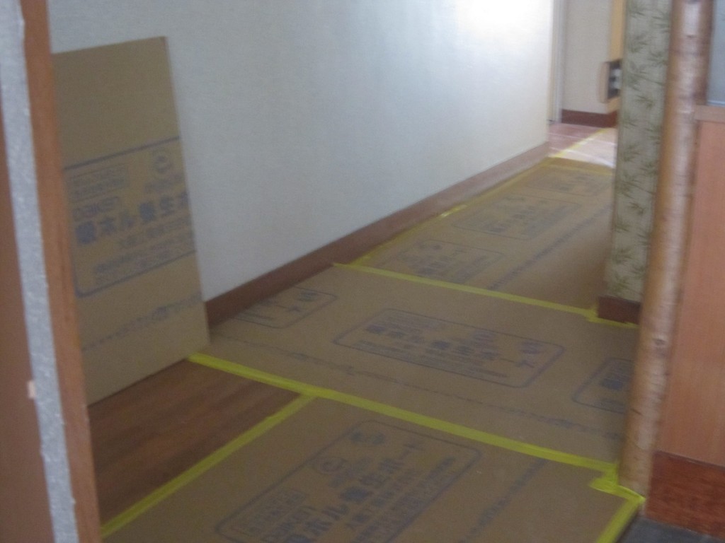本日からリフォーム工事が始まりまして先ずは入口から廊下の養生を行いました。