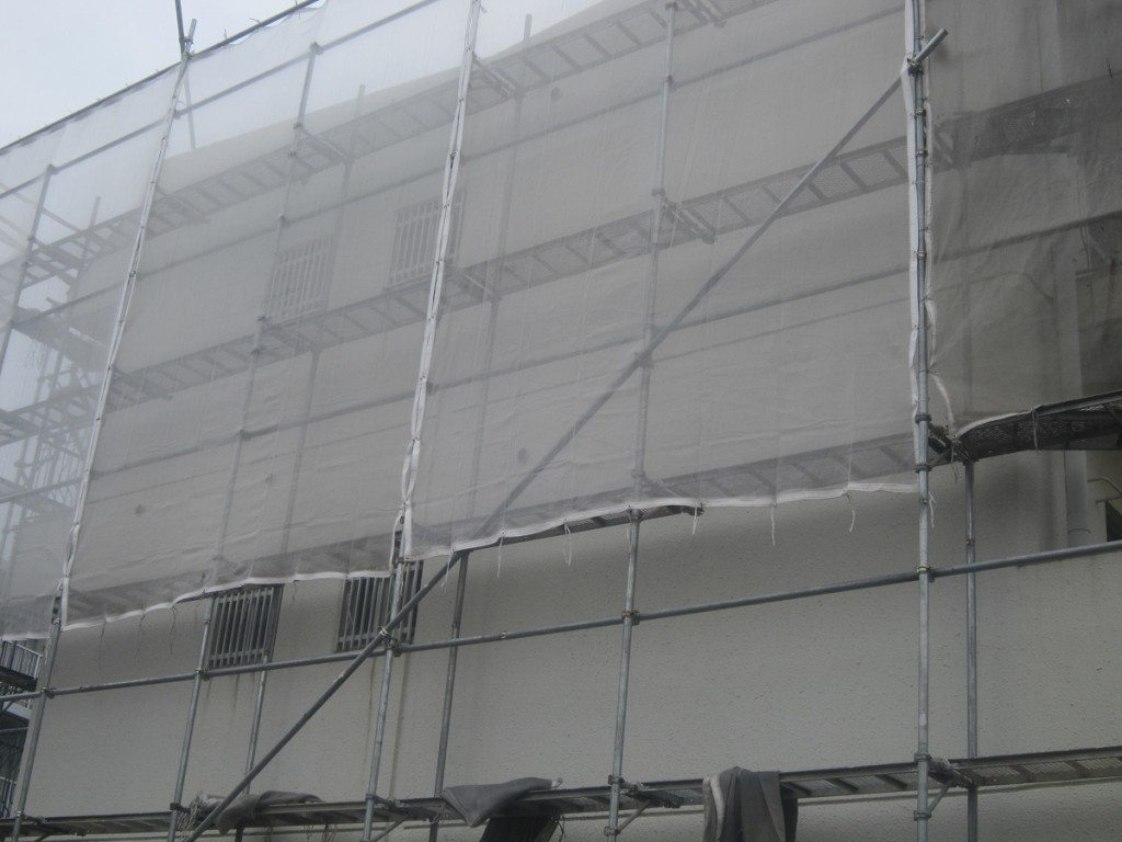 本日は昨日に引き続きマンションの外部足場の敷設工事で足場にネット張りを行ってます。 また、今日は大工さんはお休みです。