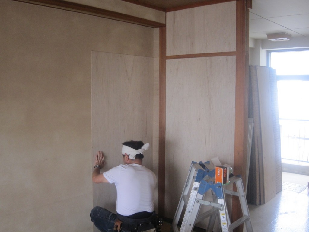 本日から内部工事は床のフロア張りが6部屋終了しまして既存内壁に下地べニア張り作業となりました。この上に クロス貼りとして仕上げます。