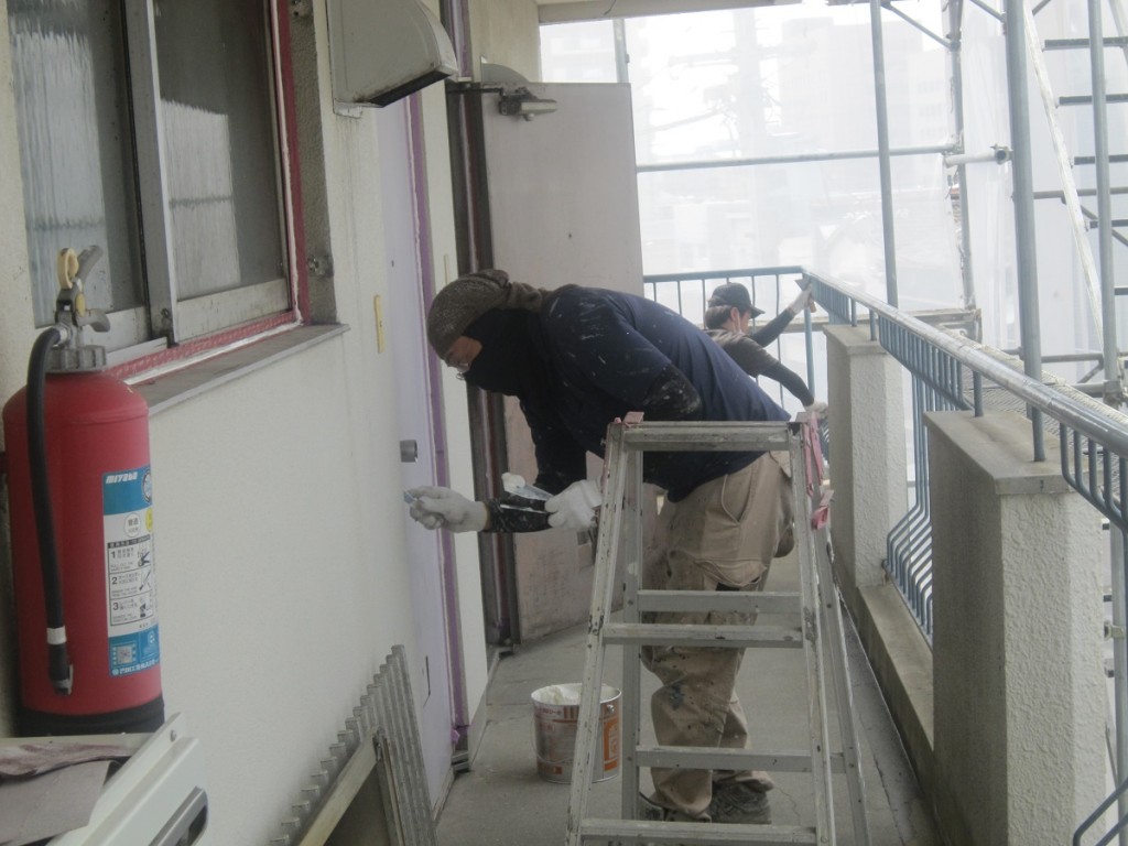 昨日引き続きまして外壁塗装に備えまして外部階段、廊下のクラック補修、手摺の錆び落とし 作業を行ってます。