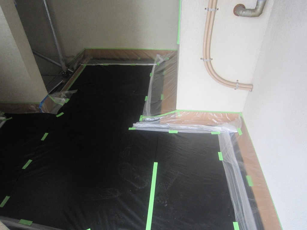 M様マンション改修で外壁塗装に当たり2階廊下、階段等に養生シートを敷き。また、養生テープを貼りまして 本格的塗装の準備作業してます。