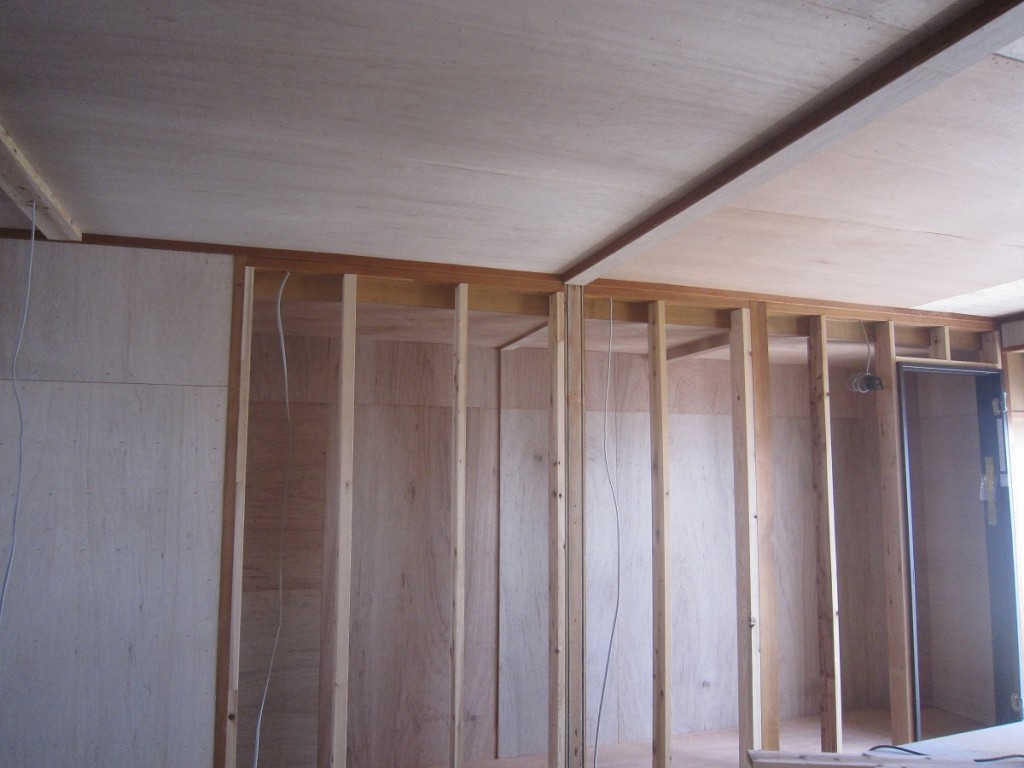内部造作も壁下地張りや収納スペースの下地もできまして部屋らしい姿が見えてきました。