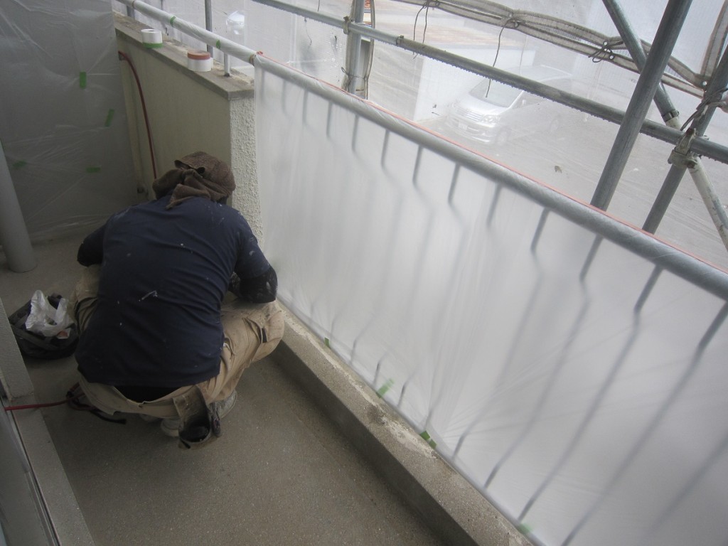 本日は雨天ですが外壁塗装工事の職人さんはベランダーの手摺養生を行ってます。 外壁塗装は晴れた日にしか出来ません。