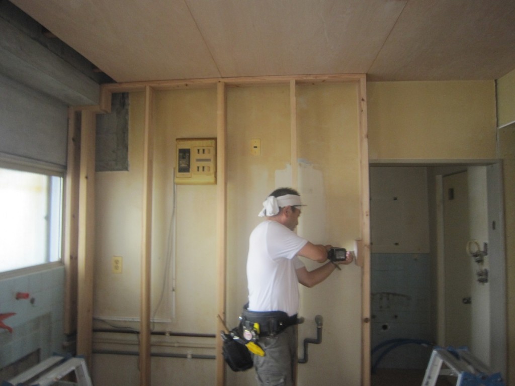 大工工事もキッチン廻りの内部壁・天井・床の下地作業に移ってます。天井部分は終わり現在壁のボード張り作業中です。