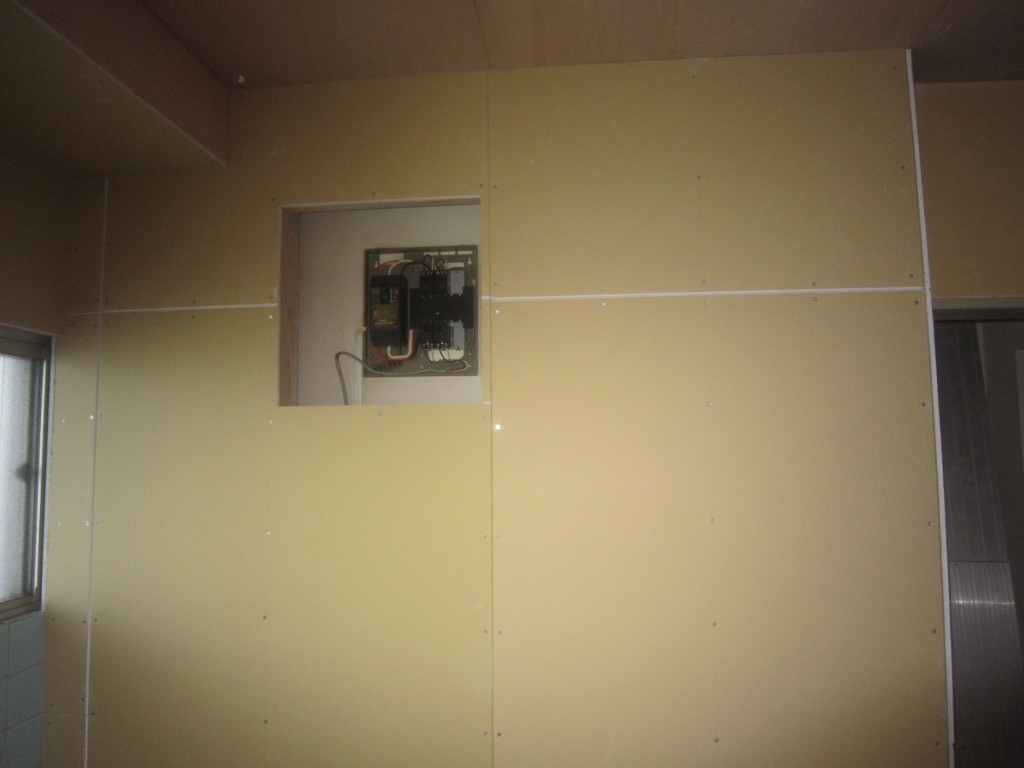 キッチン脇の内壁のボード張り作業が出来上がりました。当初の予想以上の出来映えとなりました。