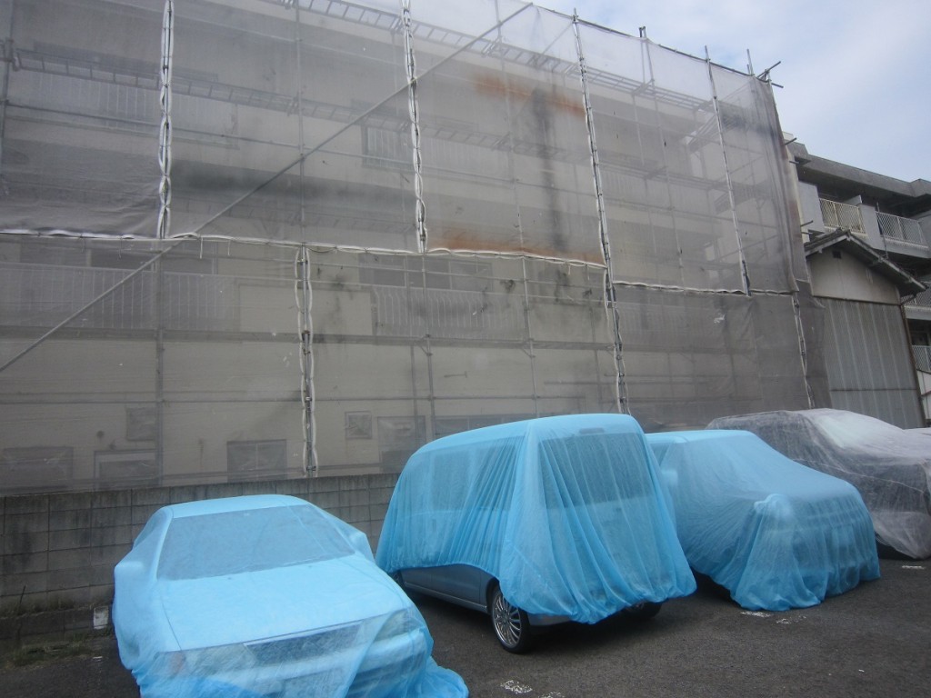 外壁塗装工事は駐車場側が開始となり駐車中の車に塗装飛ばないようにホロー養生しました。