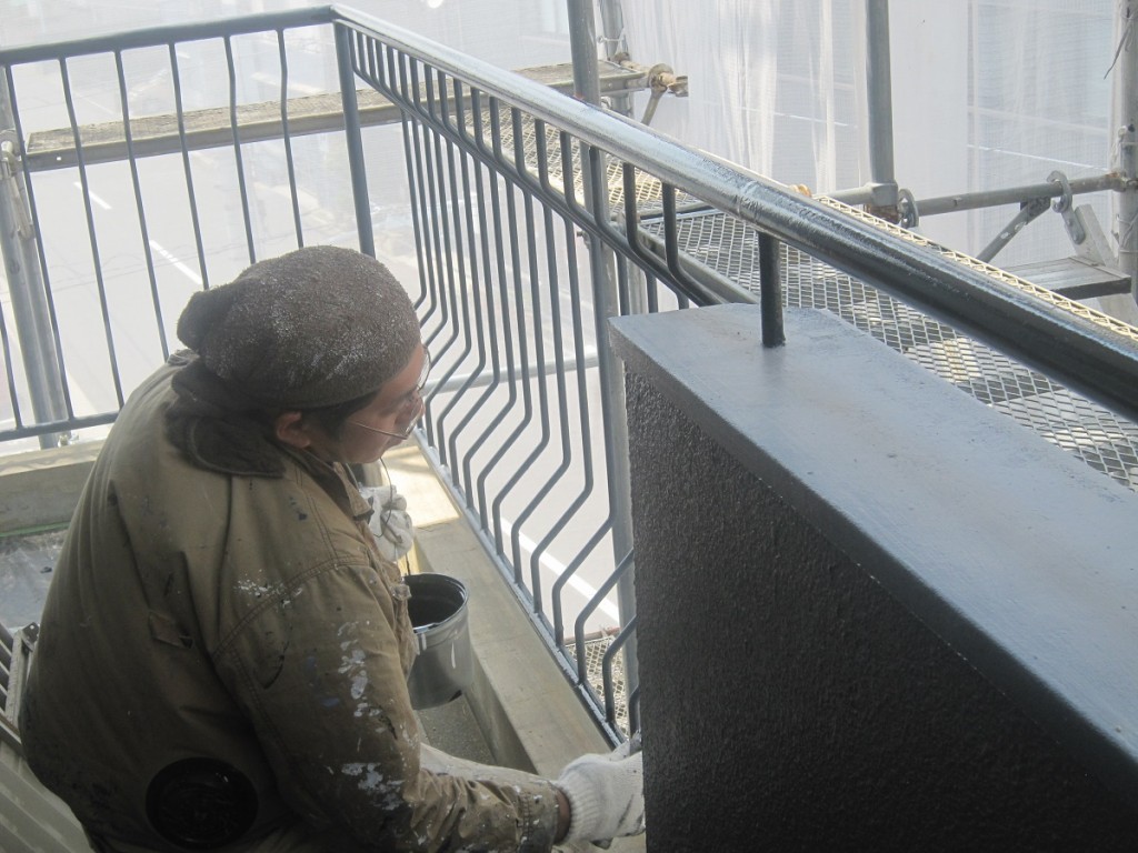 本日は塗装屋さんが手摺の最終仕上げ塗装中です。大変に丁寧な作業していただいてます。