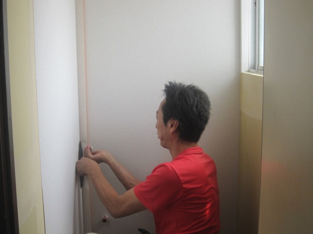 本日は大変な暑さの中クロス屋さんは赤いシャツで頑張ってトイレクロス貼り集中して作業中です。