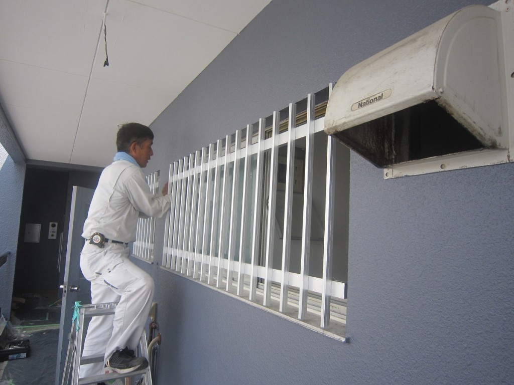 本日は玄関前のサッシに面格子取付工事を行ってます。既存サッシに取付の為施工に手間 を取ってます。