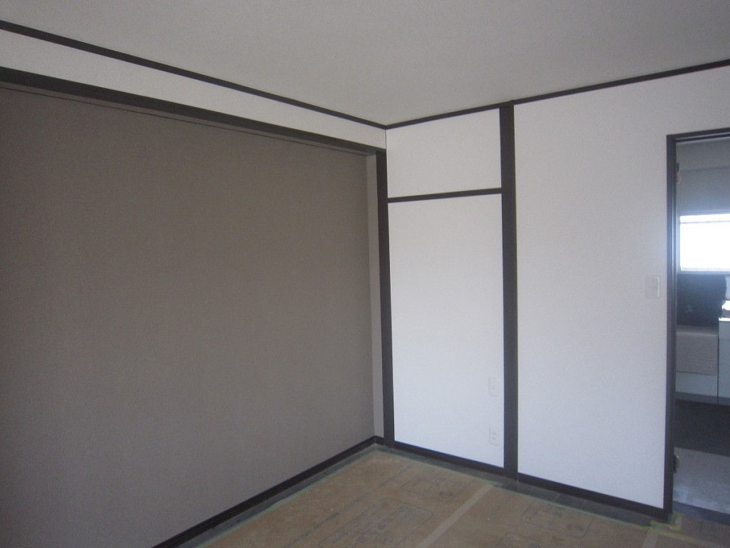 和室2部屋を間仕切り撤去して洋室1部屋にしましたが、内壁にクロス貼りが出来上がりました。また、塗装が丁寧な仕上げでとなりクロスとマッチしてます。
