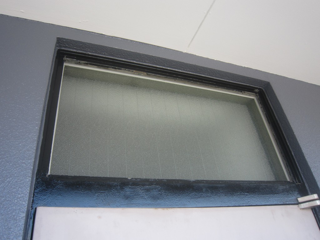 M様マンション改修工事の完工を目指して職人さんは暑い中頑張ってます。 本日は廊下面格子取付やドアの欄間部分はアルミガラリが腐食しており今回網入り硝子に交換しました。玄関ドア本体交換は工事最終としてます。