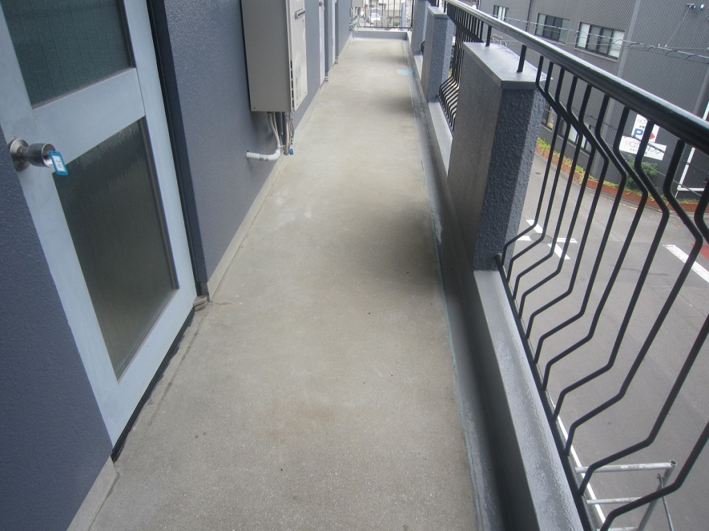 塗装工事もマンション廊下2、3階の塗装を残すだけとなりました。廊下の掃除が終わり 明日から3日間で仕上げます。