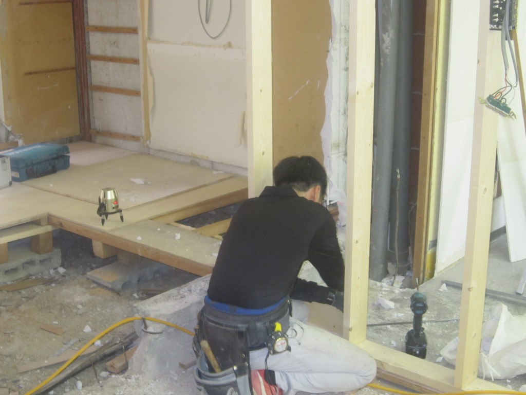 本日は大工さんが昨日に続き店舗内部の事務所部分の造作工事を行ってます。