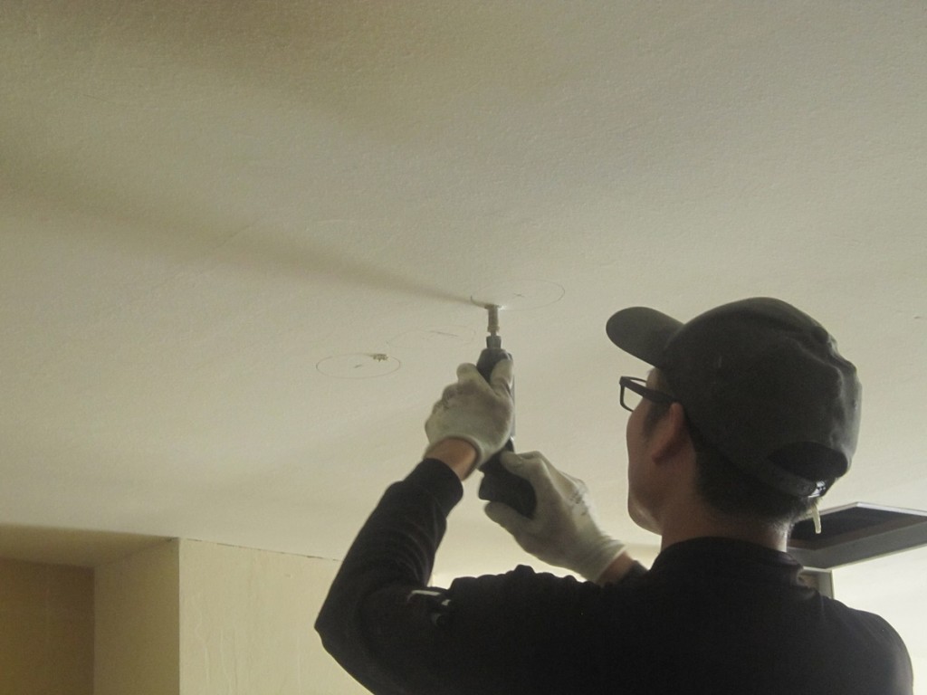 本日は店舗の照明等が決定して天井ダウンライトの穴あけ作業を行ってます。