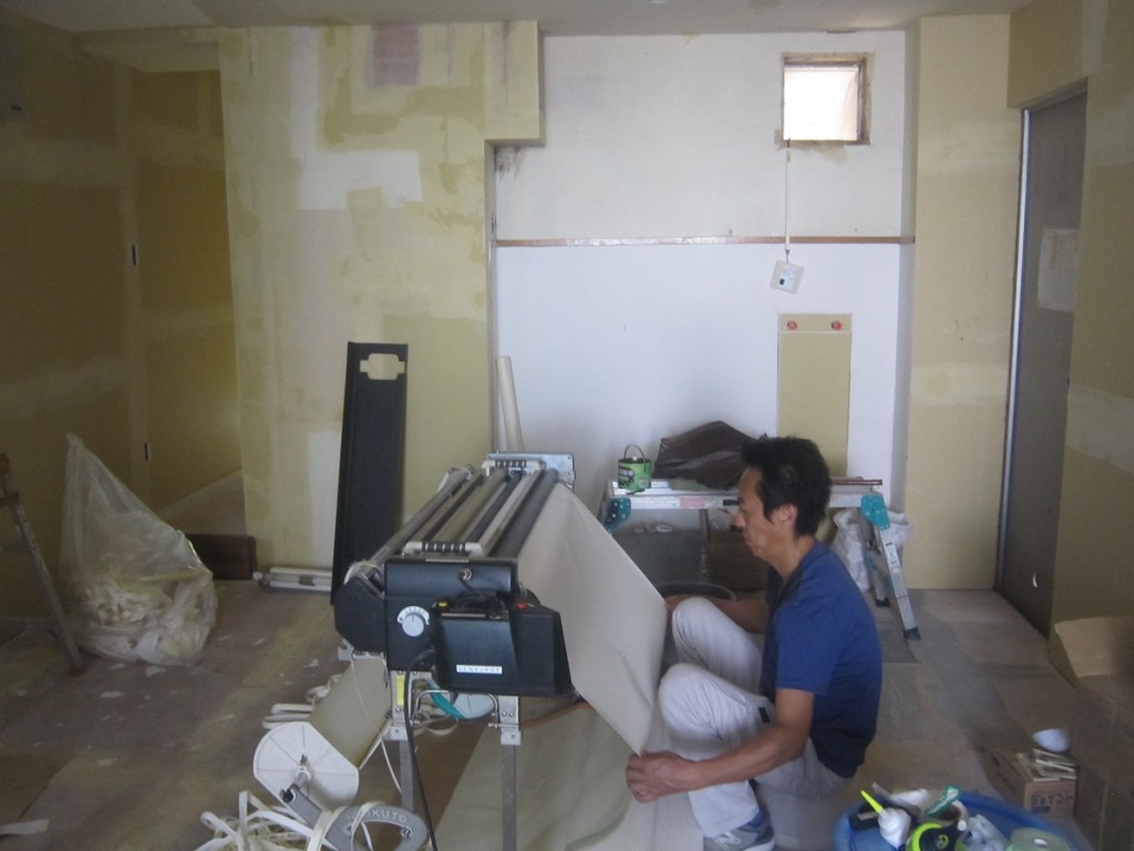 本日よりクロス貼り作業にかかってます。職人さんは壁紙にノリ付け作業中です。