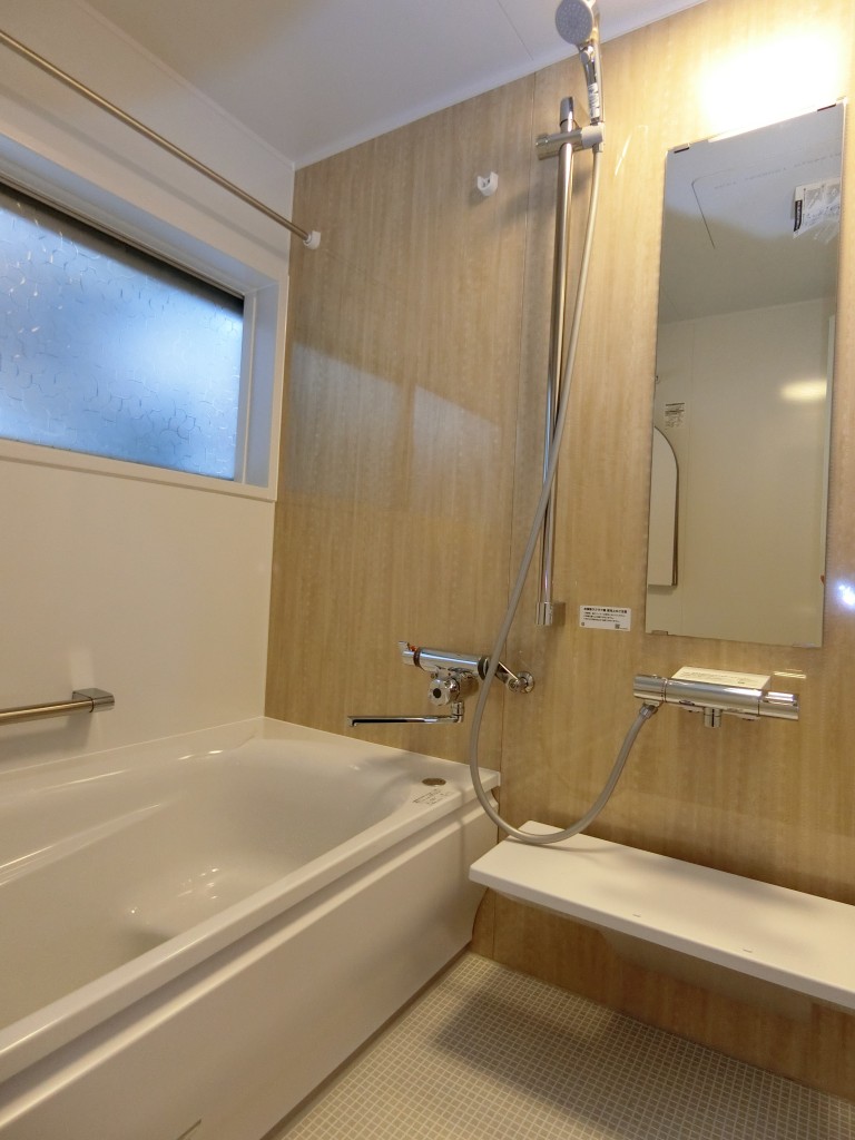 K様邸のユニットバス据付が済み脱衣室の床下地も済みまして仮に仕上げですが本日から施主様は入浴予定 です。