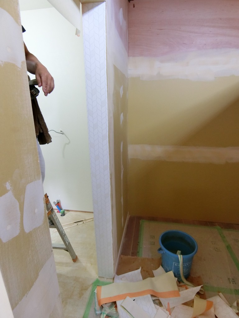 洗面の入口面には、アクセントクロスをつけました。 アウトセットのドアを開けると、ちらりと葉っぱ模様が見えるようになります♪♪